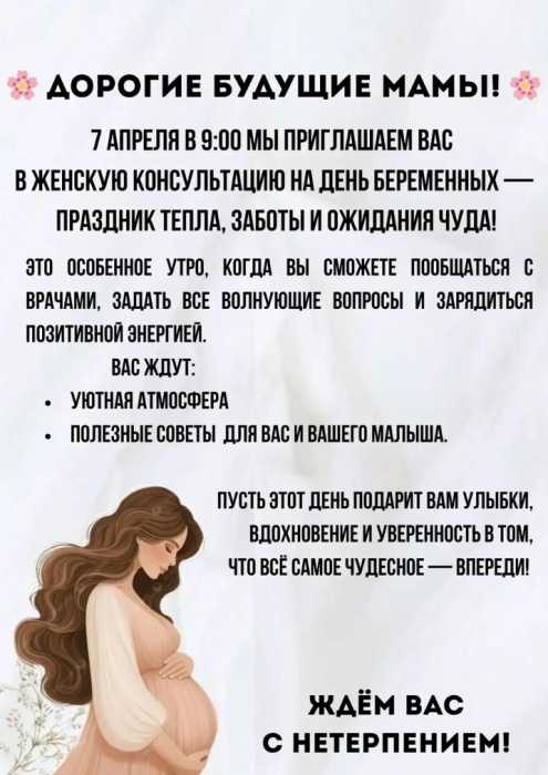 7 апреля приглашаем женщин в женскую консультацию на день беременных!