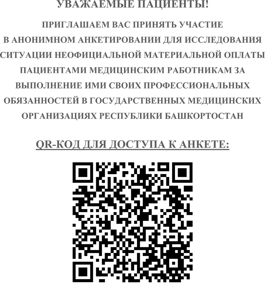 ПРИГЛАШАЕМ ВАС ПРИНЯТЬ УЧАСТИЕ В АНОНИМНОМ АНКЕТИРОВАНИИ ДЛЯ ИССЛЕДОВАНИЯ СИТУАЦИИ НЕОФИЦИАЛЬНОЙ МАТЕРИАЛЬНОЙ ОПЛАТЫ ПАЦИЕНТАМИ МЕДИЦИНСКИМ РАБОТНИКАМ ЗА ВЫПОЛНЕНИЕ ИМИ СВОИХ ПРОФЕССИОНАЛЬНЫХ ОБЯЗАННОСТЕЙ В ГОСУДАРСТВЕННЫХ МЕДИЦИНСКИХ ОРГАНИЗАЦИЯХ РЕСПУБЛИКИ БАШКОРТОСТАН по ссылке: https://forms.yandex.ru/u/68c2777bf47e73320c82ee18