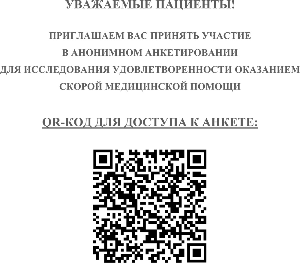 ПРИГЛАШАЕМ ВАС ПРИНЯТЬ УЧАСТИЕ В АНОНИМНОМ АНКЕТИРОВАНИИ ДЛЯ ИССЛЕДОВАНИЯ УДОВЛЕТВОРЕННОСТИ ОКАЗАНИЕМ СКОРОЙ МЕДИЦИНСКОЙ ПОМОЩИ по ссылке: https://forms.yandex.ru/u/68d4c40ad04688066335674c
